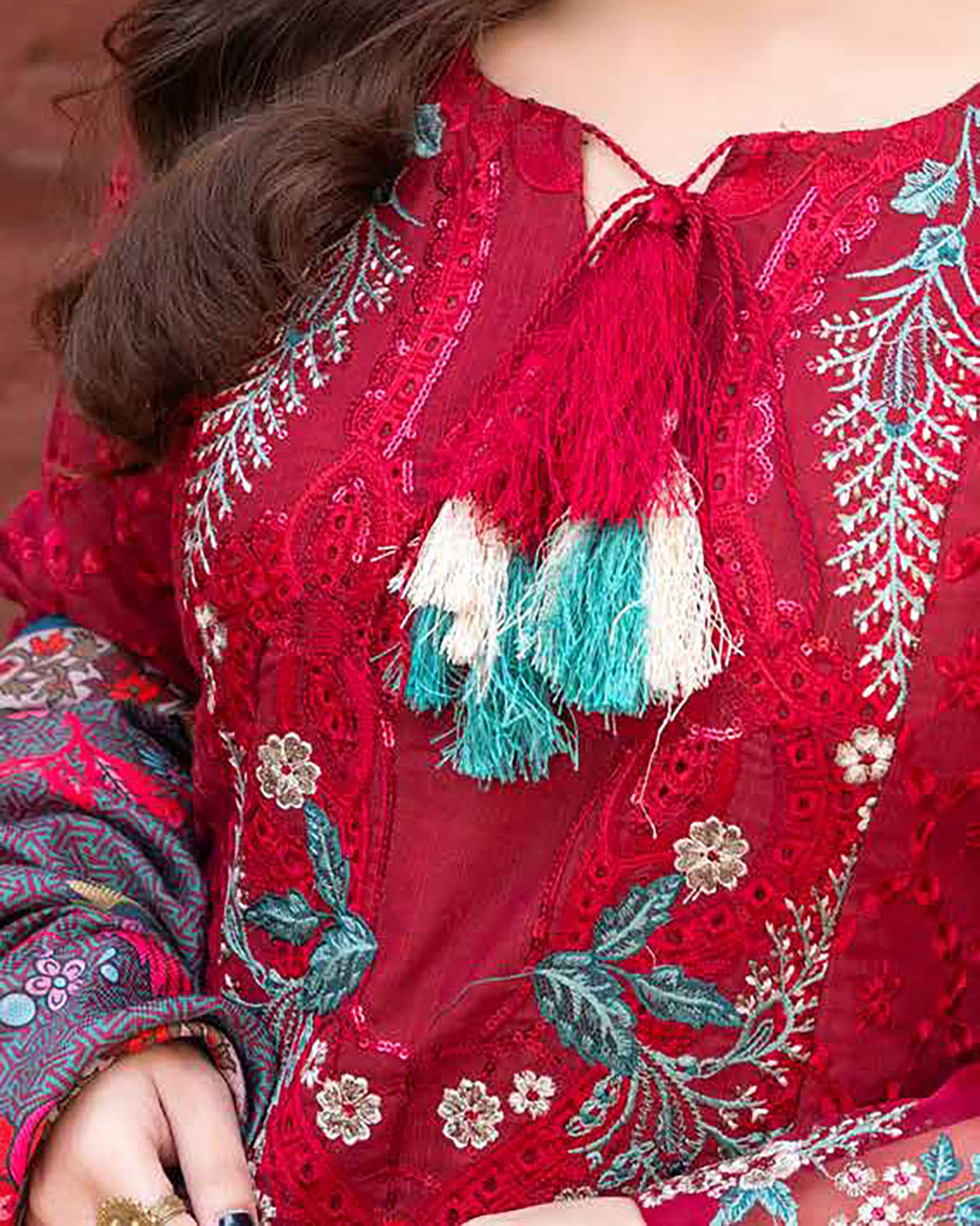 Exquisite Designer Embroidered Shirt, Masterfully Crafted Hem, Featuring Delicate Organza Work, Radiant Sequins, Elegant Buttons, Attractive Schiffli, Intricate Thread Work, 3D Flowers and Timeless Embroidery at Neckline, Organza Patched on Sleeves. Paired with a Vibrant Digital Printed Silk Viscose Shawl and Sleek Plated Trousers for an Elegant, Captivating Look.