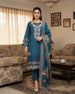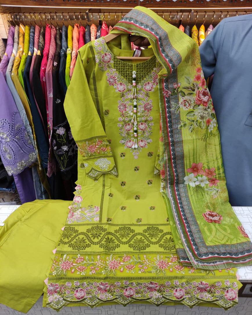 Exquisite Designer Embroidered Shirt, Masterfully Crafted Hem, Featuring Delicate Schiffli Work, Radiant Sequins, Elegant Organza Work, Attractive Buttons/Tussles, Intricate Thread Work and Timeless Embroidery at Neckline, Fancy Embroidery on Sleeves with Organza. Paired with a Vibrant digital Printed Diamond Dupatta and Sleek Plain Trousers for an Elegant, Captivating Look.