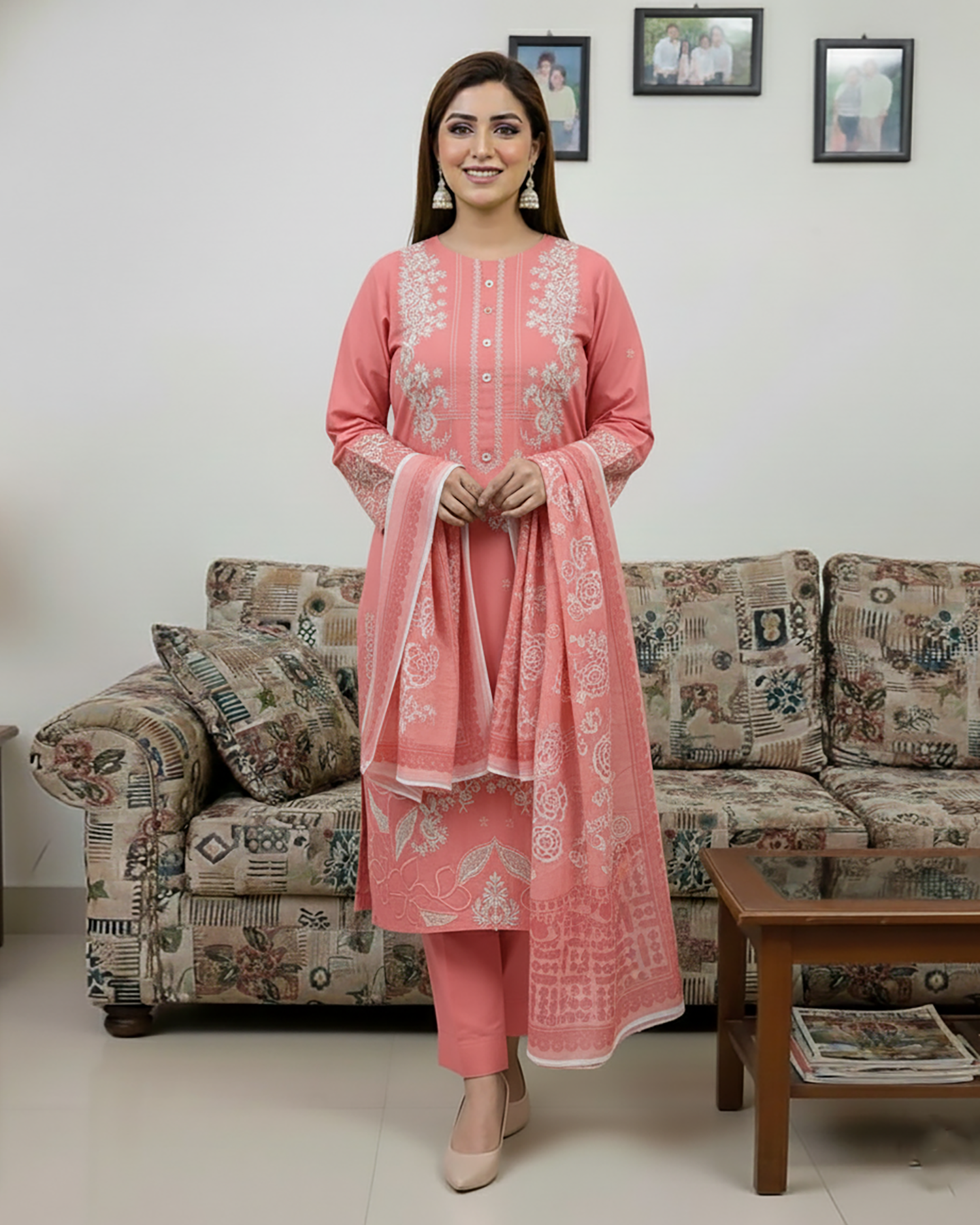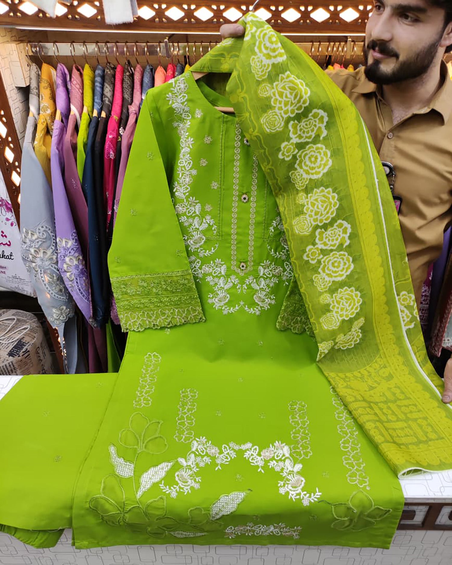 Exquisite Designer Embroidered Shirt, Masterfully Crafted Hem, Featuring Delicate Tilla Work, Radiant Sequins, Elegant Organza Work, Attractive Buttons, Intricate Thread Work and Timeless Embroidery at Neckline, Fancy Embroidery on Sleeves with Organza. Paired with a Vibrant digital Printed Monar Dupatta and Sleek Embroidered Flappers for an Elegant,