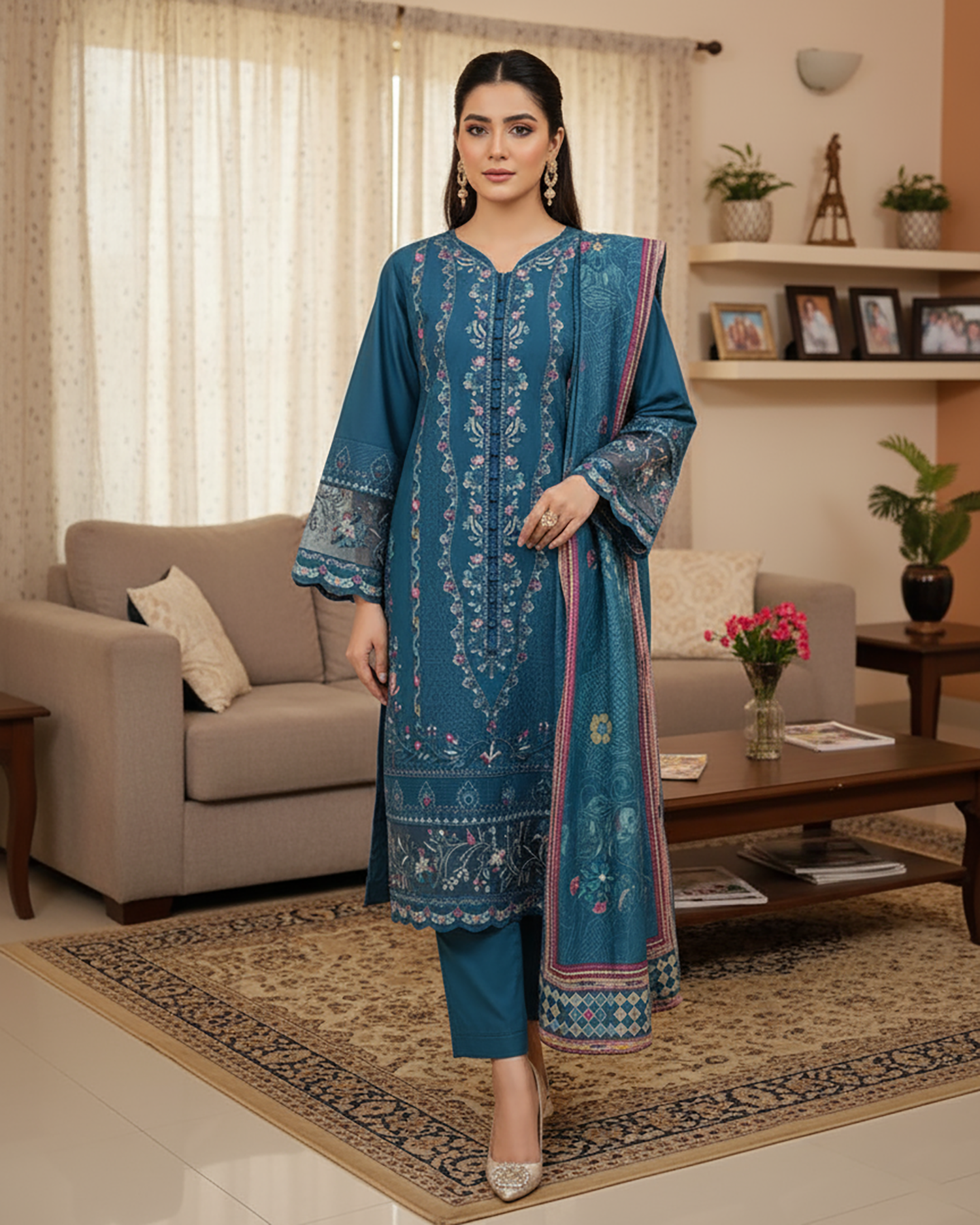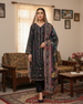 Elegant And Fascinating Designer Embroidered Shirt Embellished With Buttons, Organza Lace, Sequins and Thread Work With Printed Winter Shawl Along With Plain Trousers.