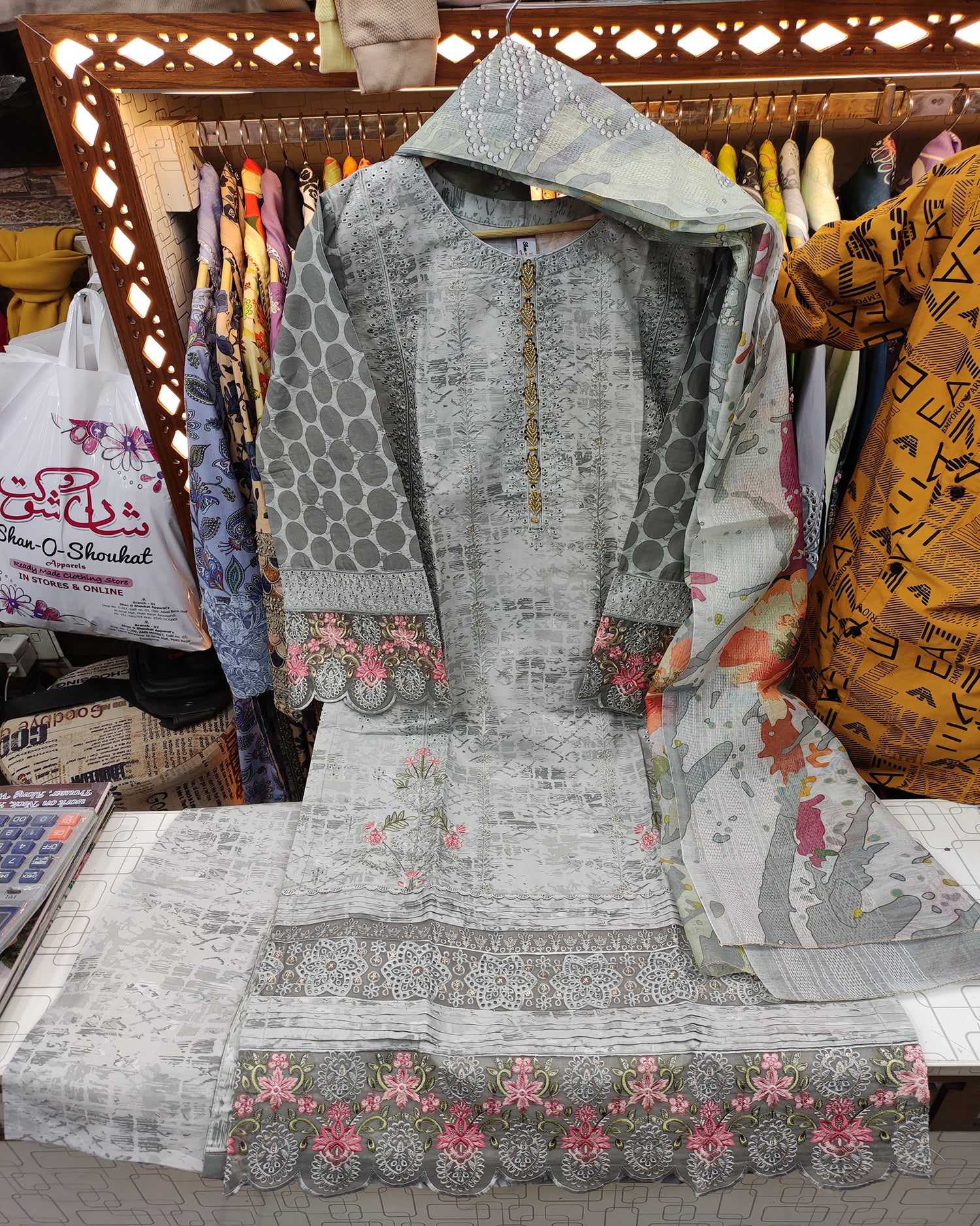 Elegant And Fascinating Designer Heavy Thread Embroidered Jacket with Embroidered Inner Shirt Embellished With Pom Pom, Lace and Thread Work With Printed Bambar Chiffon Dupatta Along With Embroidery Trousers.