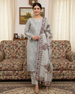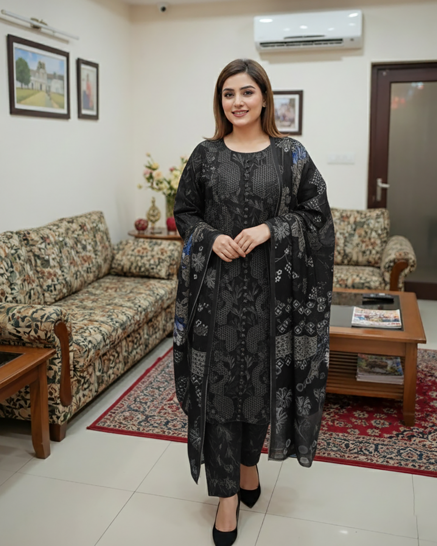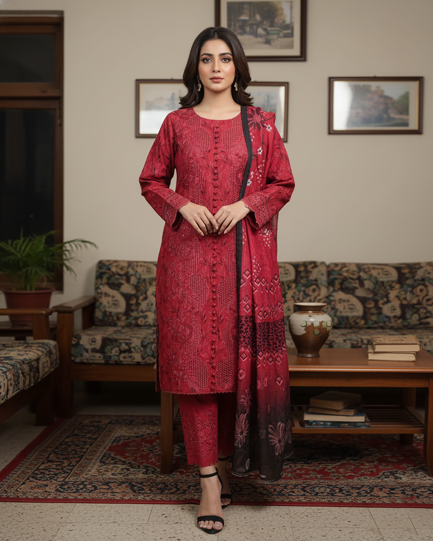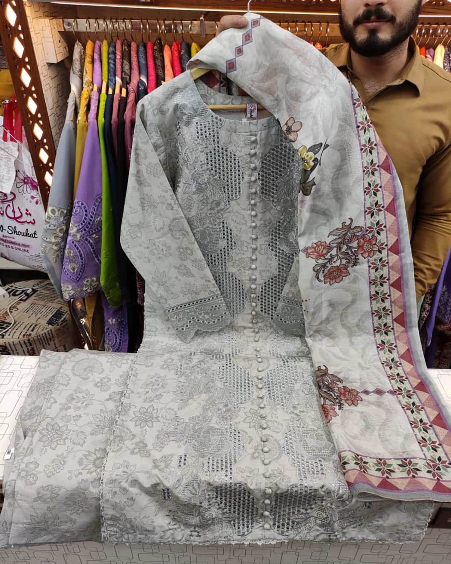 Exquisite Designer Embroidered Shirt, Masterfully Crafted Hem, Featuring Delicate Schiffli Work, Radiant Sequins, Elegant Organza Work, Attractive Buttons, Intricate Thread Work and Timeless Embroidery at Neckline, Fancy Embroidery on Sleeves with Organza. Paired with a Vibrant digital Printed Monar Dupatta and Sleek Printed Trousers for an Elegant, Captivating Look.