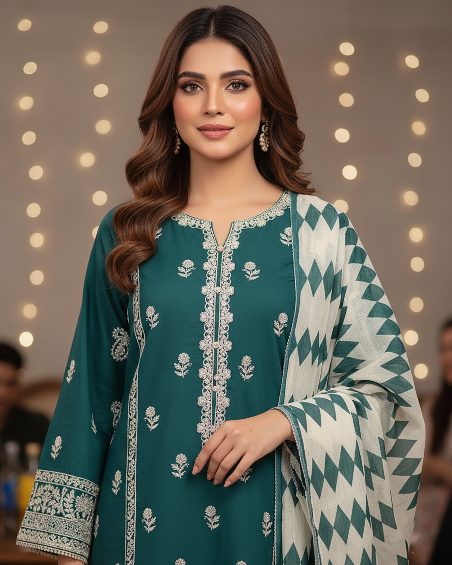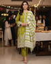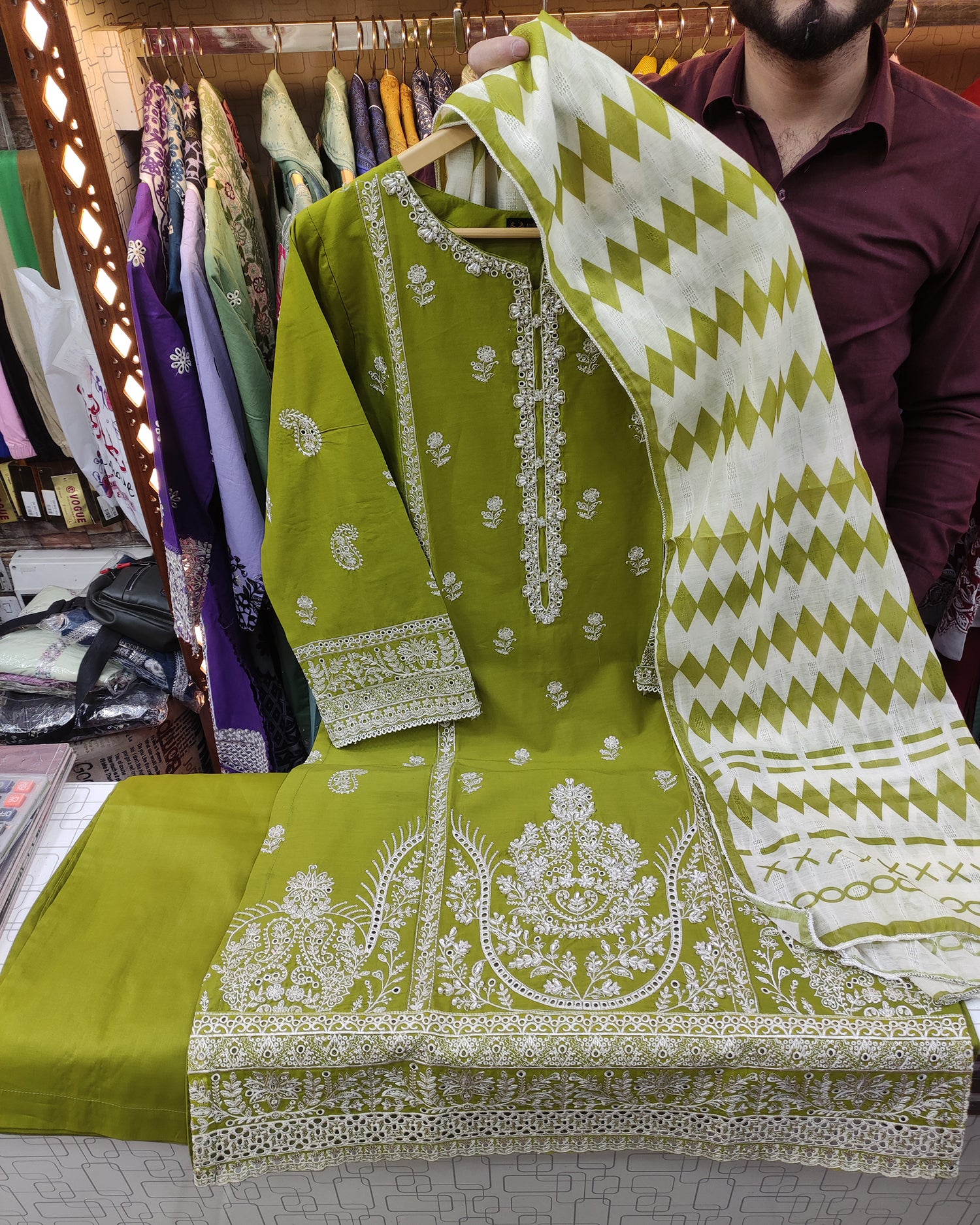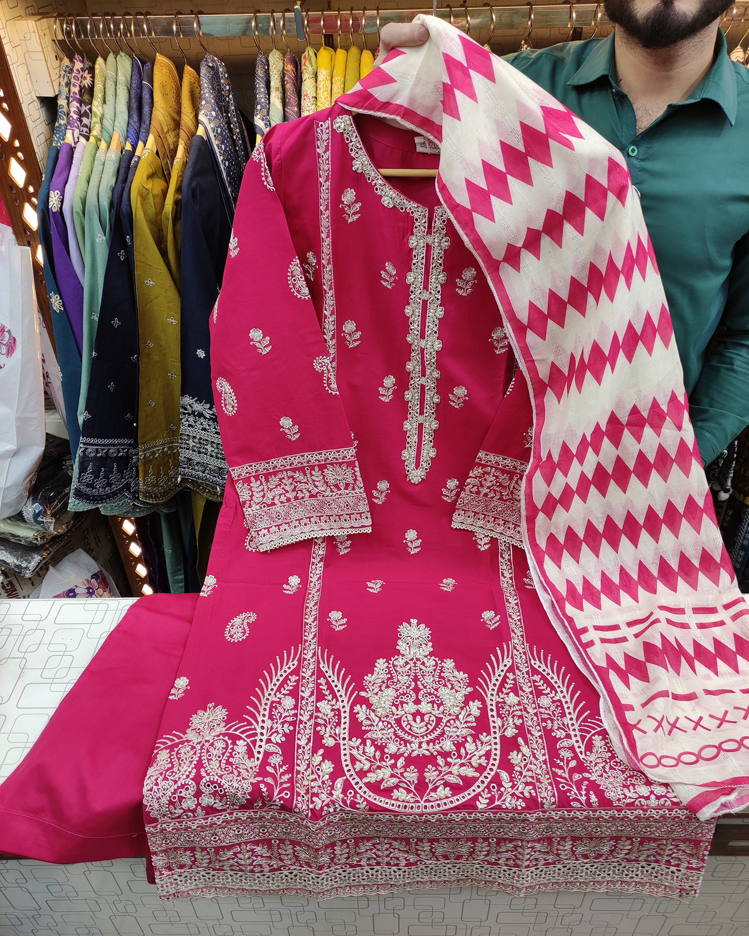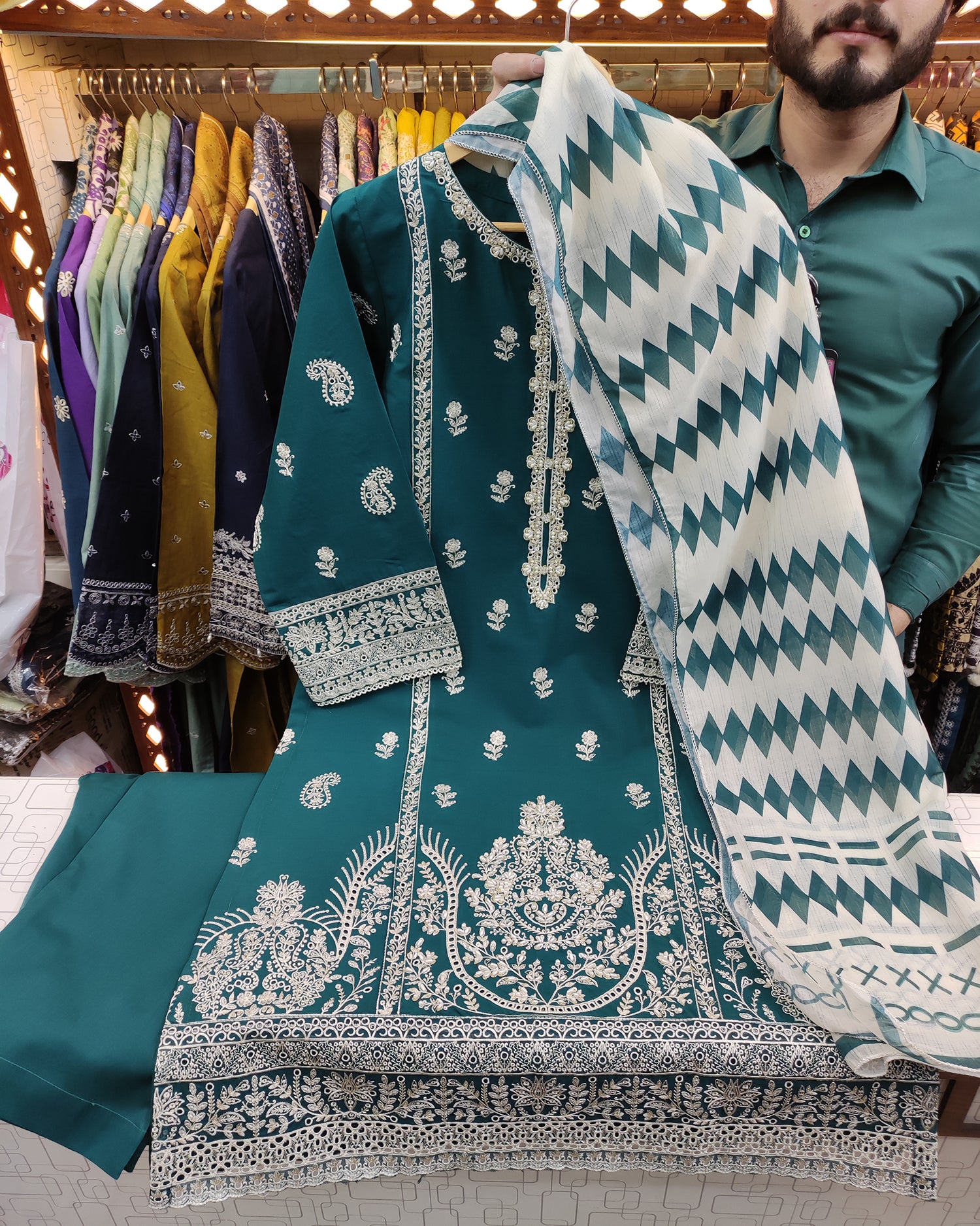 Elegant And Fascinating Designer Embroidered Shirt Embellished With Handwork, Schiffli, Lace, Sequins Work and Thread Work With Printed Dupatta Along With Plain Trousers.