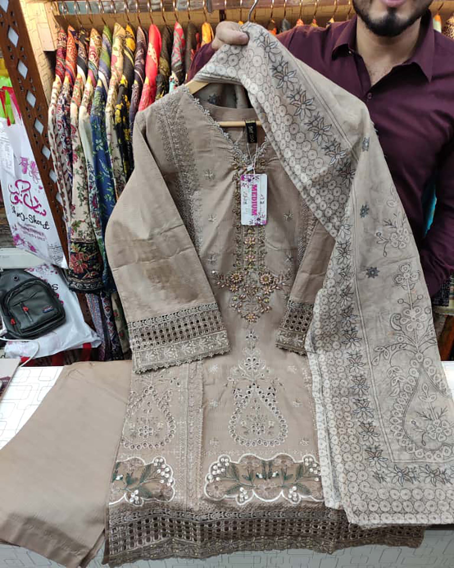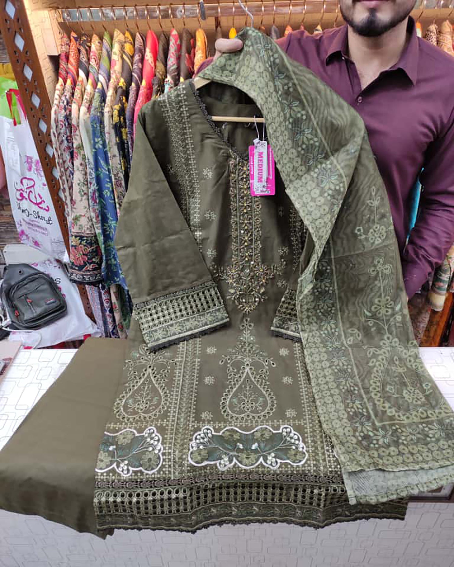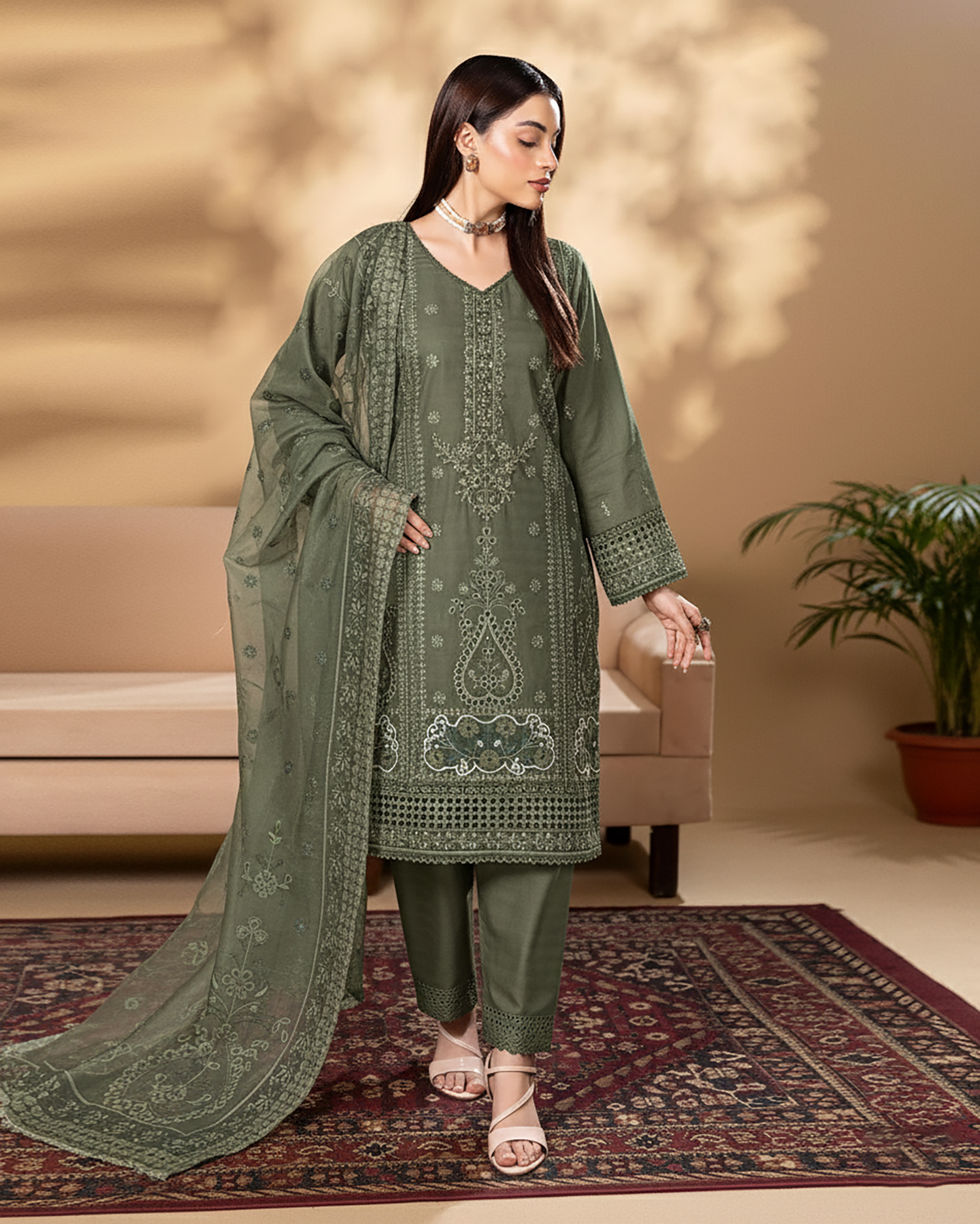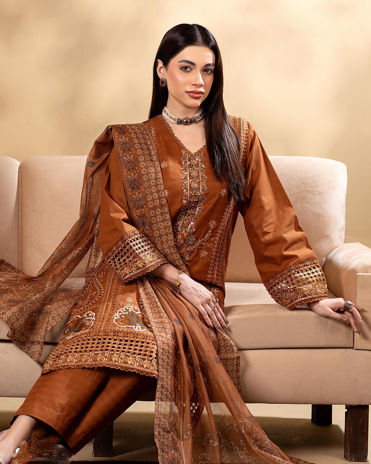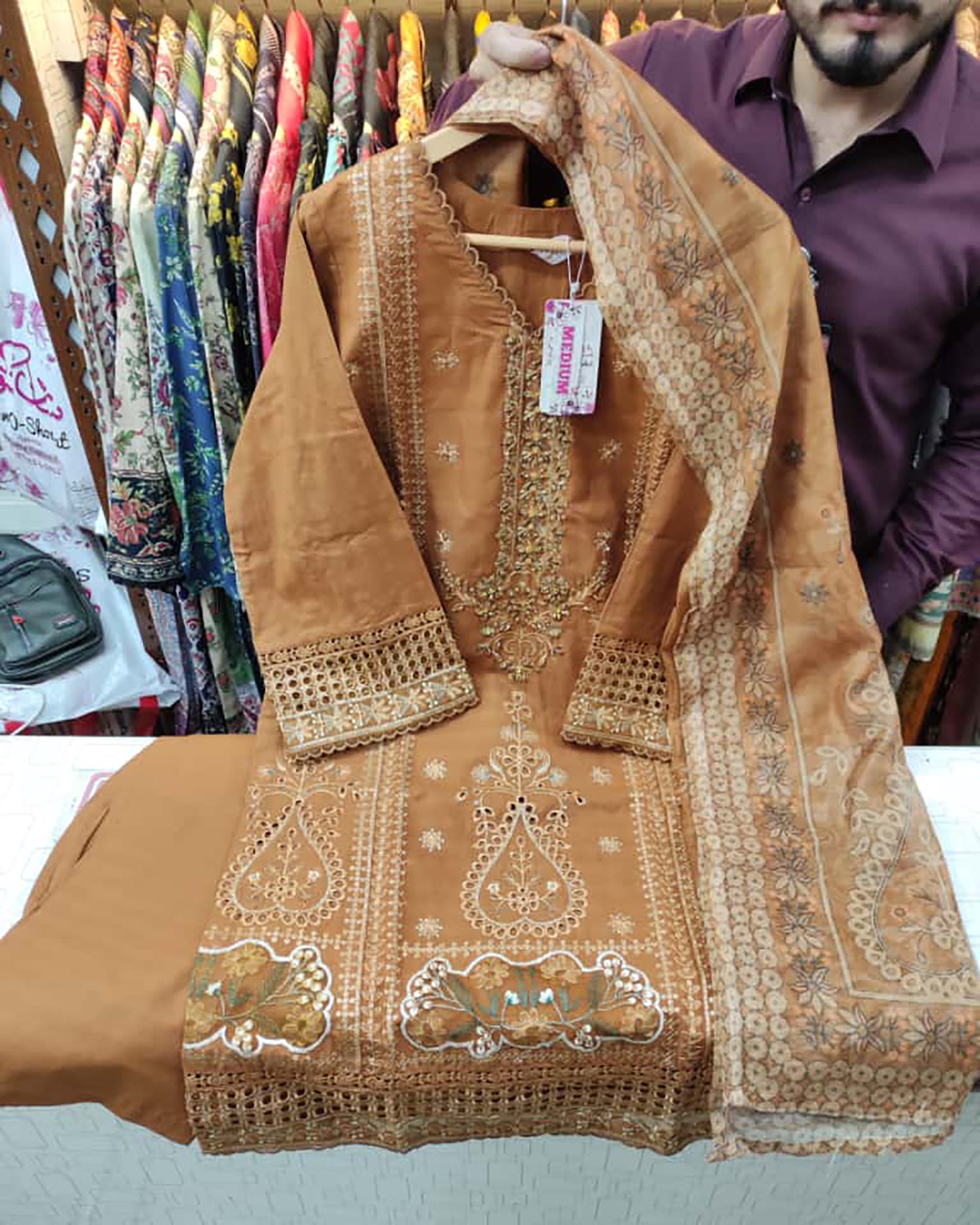 Very Elegant And Beautiful Designer Embroidered Shirt Embellished with Sequins, Boring, Organza, Hand Work, Lace and Dense Thread work at Neck line, Daman and Sleeves Paired with Printed Net and Plain Trousers