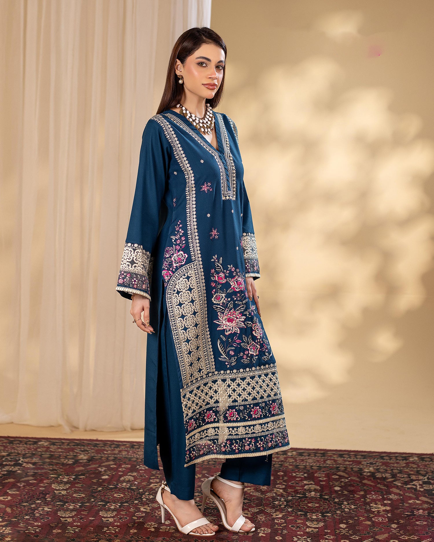 Very Elegant And Beautiful Designer Embroidered Shirt Embellished with Sequins, Boring, Organza, Hand Work, Lace and Dense Thread work at Neck line, Daman and Sleeves Paired with Printed Winter Shawl and Plain Trousers.