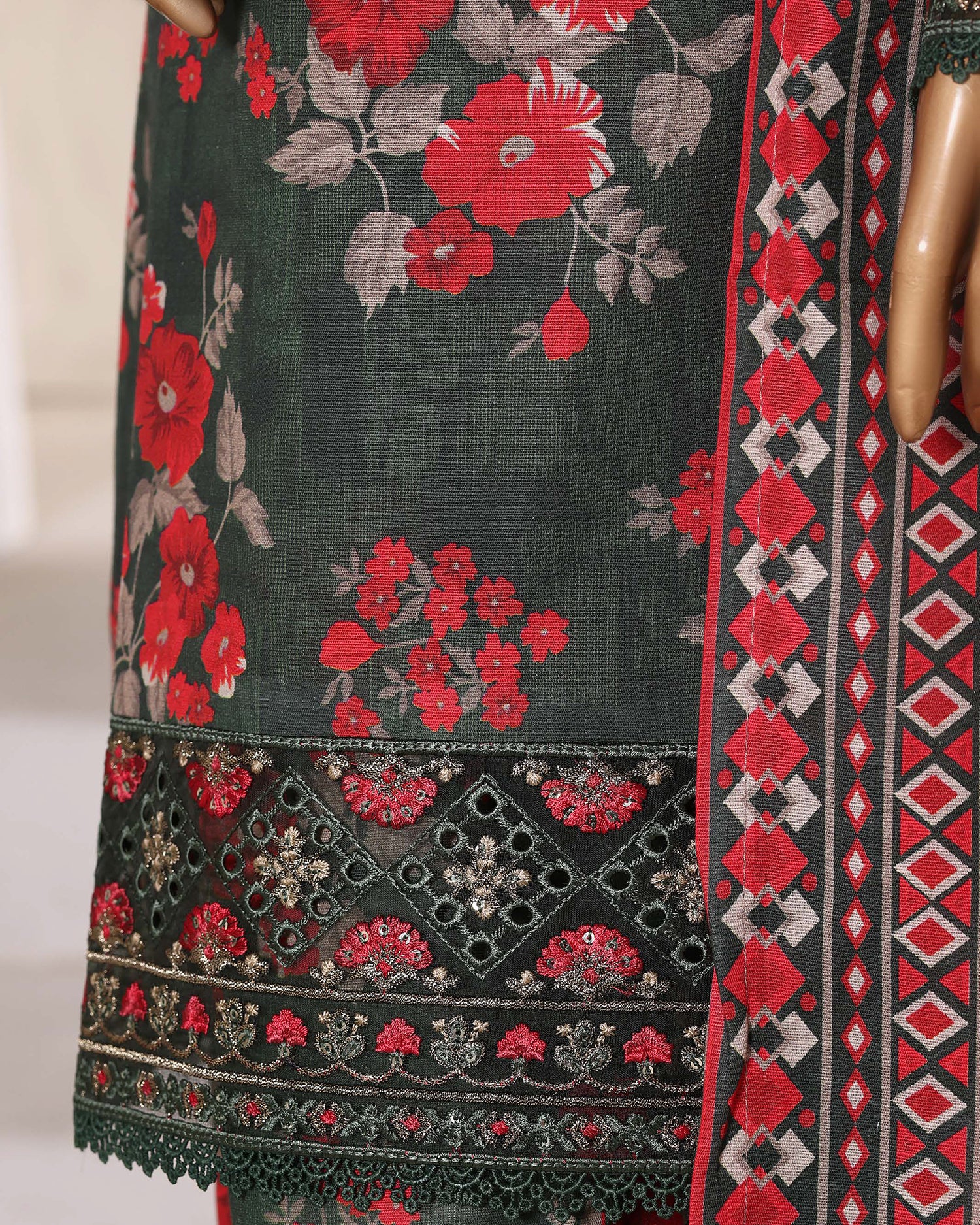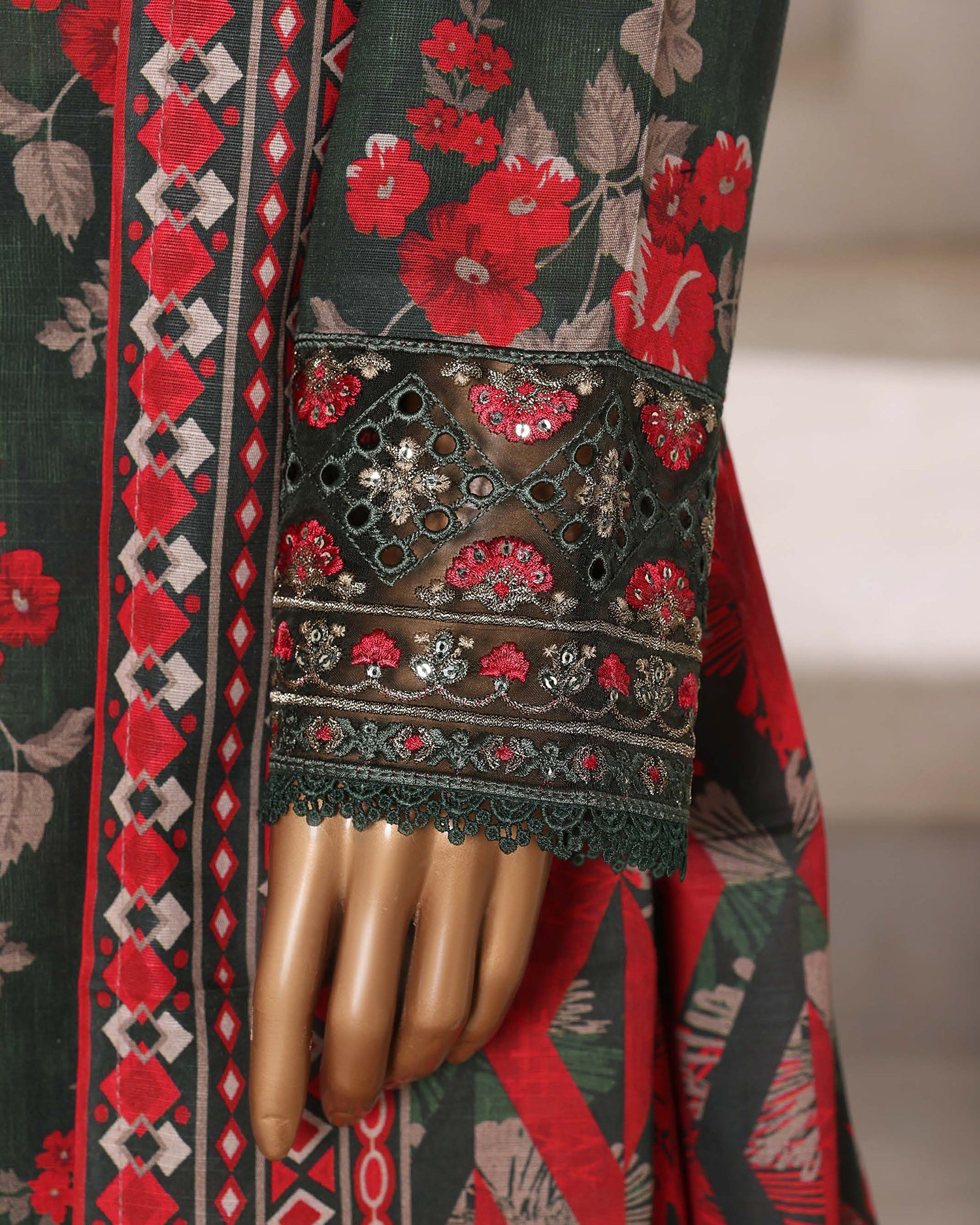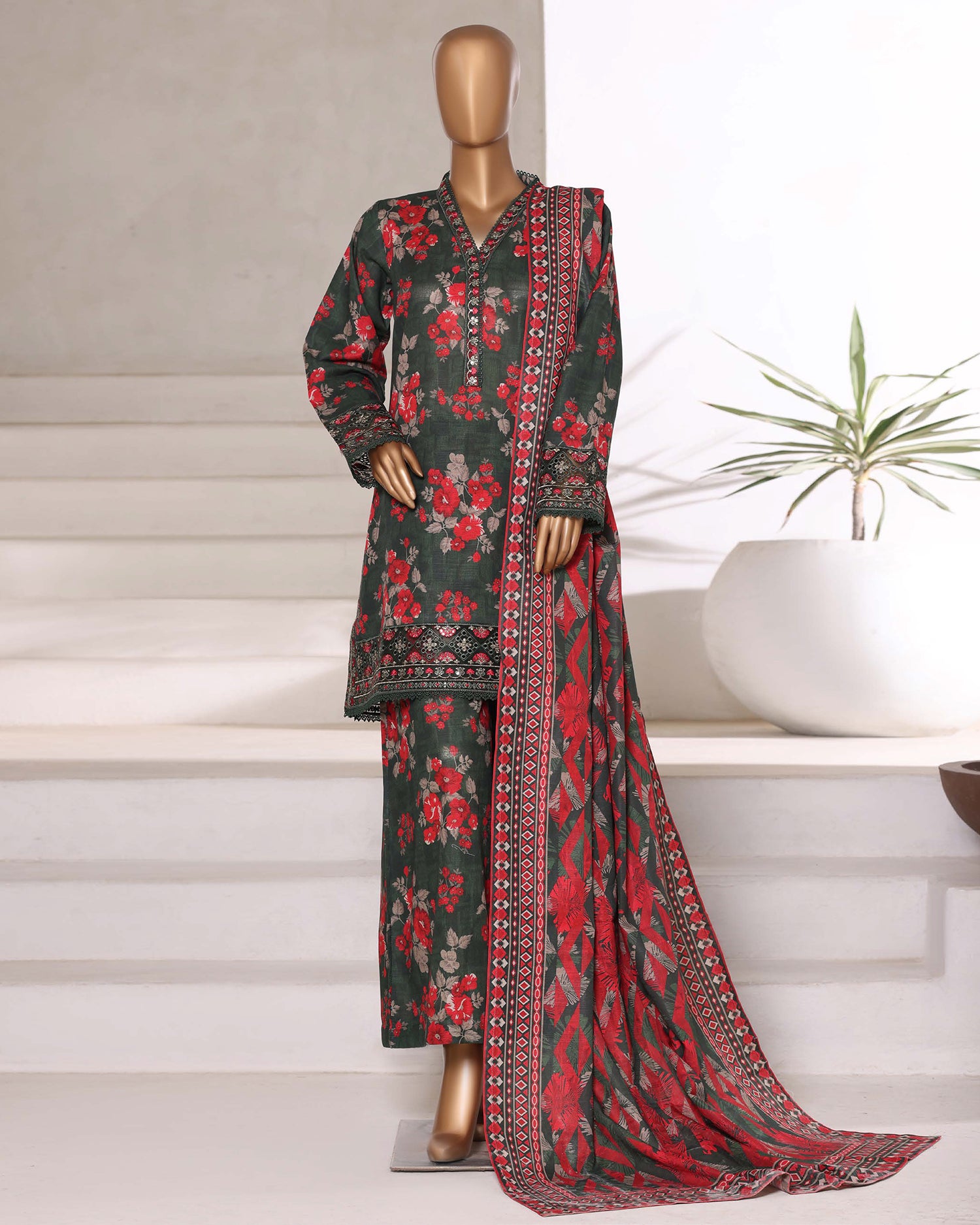 Exquisite Designer Patches Embroidered Shirt, Masterfully Crafted Hem, Featuring Delicate Sequence Work, Radiant Buttons/Tussles, Intricate Thread Work, and Timeless Backside Embroidery. Paired with a Vibrant Printed Khaddar Shawl and Sleek Printed Ultra Wide Flappers for an Elegant, Captivating Look.