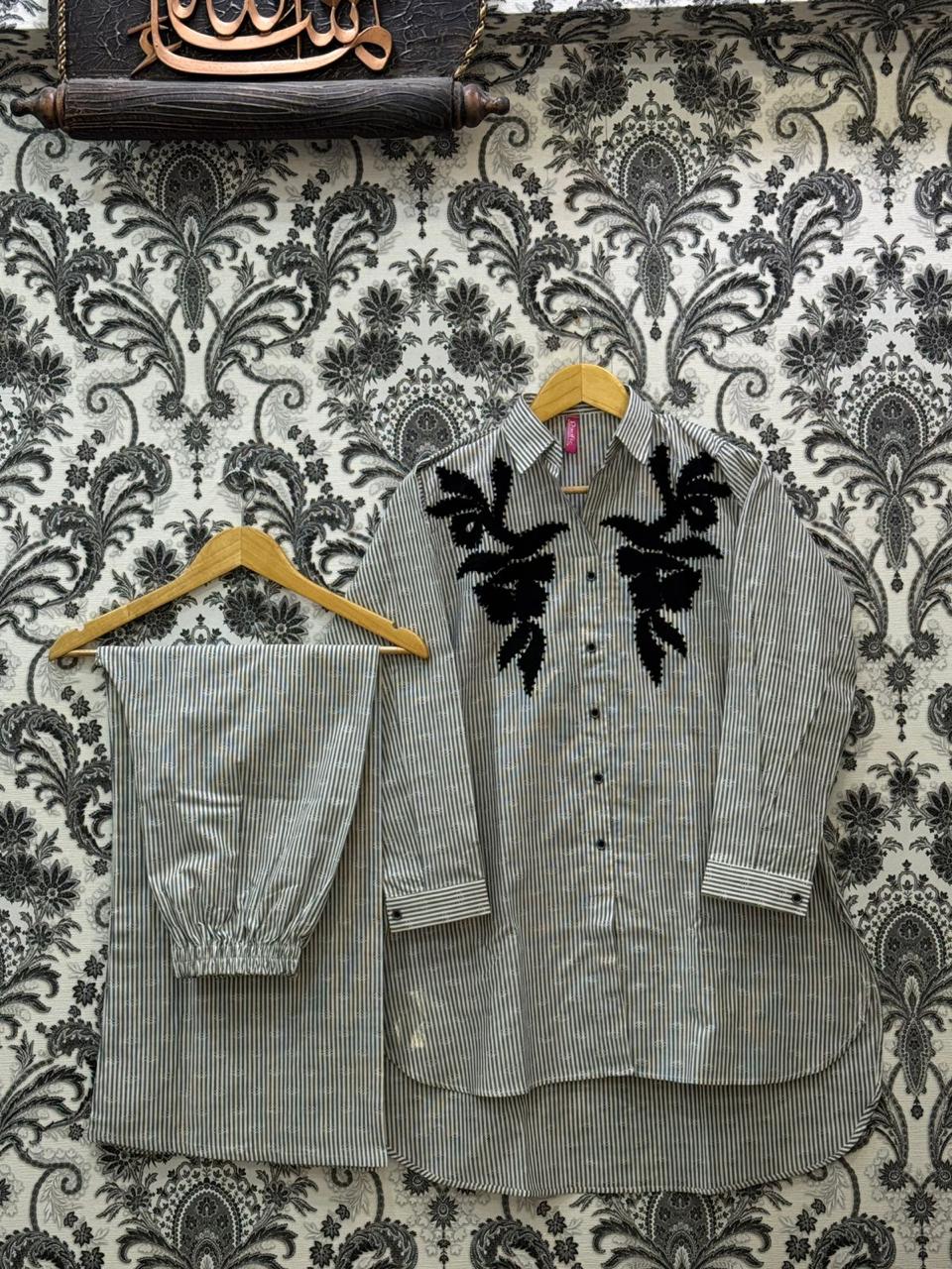 Elegant And Stylish Digital Printed Collar and Tail Styled Embroidered Shirt Embellished With Buttons and Round Cut Edge Hem and Digital Printed Flappers